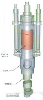 The Holte Casing Driver was designed to be small and compact as well as hard hitting. In operation the Casing Driver works similar to a down hole hammer. When the anvil closes, the Casing Driver starts operating. The more the anvil is closed, the harder the Casing Driver hits. This happens when increased air pressure and volume feed the Casing Driver, which makes the piston operate faster and harder.