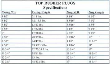 Our cementing plugs come in both wooden and rubber designs. Our wooden plugs are constructed from High Grade wood and specially compounded rubber. Top rubber plugs have a special non-metallic core designed for easy drill out. Bottom plugs are available with either an aluminum alloy cylinder or with a plastic composite core. The plastic core has a high tensile strength and possesses a greater compressive strength (30ksi) over the aluminum alloy (24ksi). |